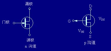 图1(b)门极的箭头指向为p指向 n方向,分别表示内向为n沟道JFET,外向为p沟道JFET。